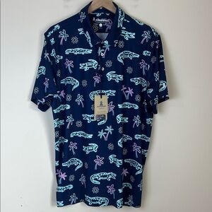Vibrant blue polo with tropical print. Features palm trees and crocodiles. Perfect for casual outings.