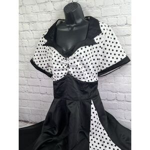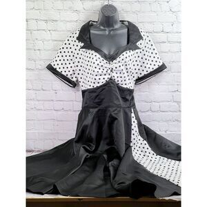 Stunning 50's style Black White Polka dot rock n Roll dress size 5xl, the upper part with stretch, side zip closure, length 48, shoulder 17.5, under arm to under arm 23, waist 42, great dress for a fun occasion premium quality