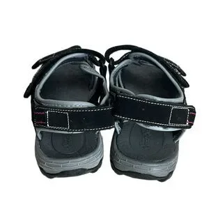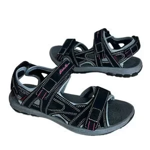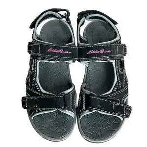 Stay comfortable on every adventure with these Eddie Bauer Madrona water sandals. Designed in versatile black with gray accents and subtle pink stitching, these sporty sandals feature adjustable hook-and-loop straps for a secure, customizable fit. The cushioned footbed and durable, water-friendly construction make them perfect for hiking, beach days, river walks, and everyday summer wear. A rugged rubber outsole provides reliable traction on wet and dry surfaces. Excellent gently preowned condition! Ready for your outdoor adventures!
