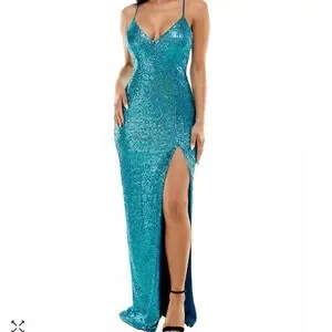 NWT Juniors' Sequined High-Slit long dress Gown teal for prom or hoco, X…