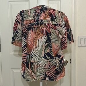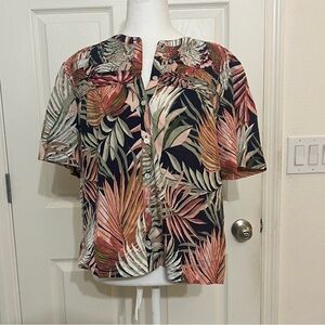 Vibrant tropical design with button-down front. Perfect for casual outings. Size tag is missing. I would say it's a S/M. If you have any other questions let me know
