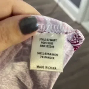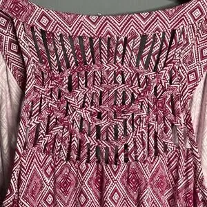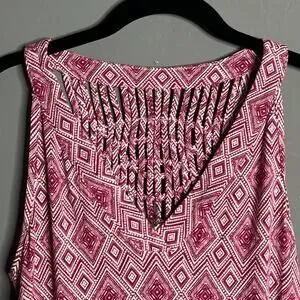 Dark pink and white geometric print. Low v neckline. Lattice design on the back is so cute.