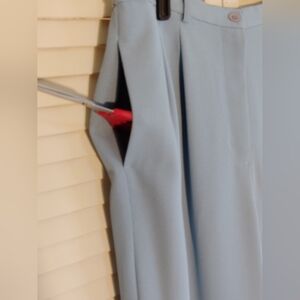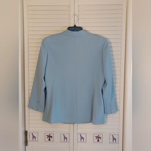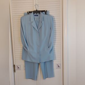 Classic tailored jacket with notch collar and front buttons. Matching pants. Soft light-blue fabric for a polished look.