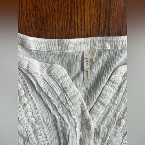 Elegant white textured blouse with button-up front. Features intricate detailing along the neckline.