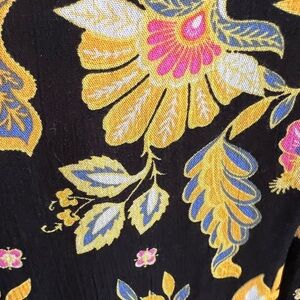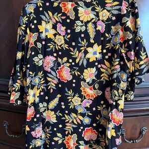 This vibrant blouse features a lively floral pattern in pink and yellow against a dark background. Designed with a relaxed fit and 3/4 sleeves, it offers both comfort and style for any casual outing. The boxy silhouette enhances its laid-back appeal, making it a perfect addition to your wardrobe.