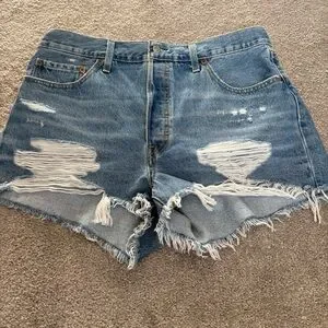 Classic Levi’s 501 distressed cutoff shorts in a light vintage-inspired wash. An iconic style that defines your waist and hugs you in all the right places, these 501 Original Shorts are comfy and leg-lengthening. Features the iconic button fly, raw hem, and distressing for an effortless, worn‑in look. Perfect for summer styling, festivals, casual wear, or vintage denim outfits.