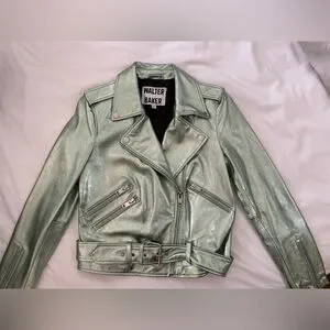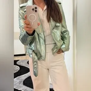 β¨ Stunning Walter Baker Allison moto jacket in a rare metallic mint finish. Crafted from 100% soft lambskin leather, this statement biker-style jacket blends classic moto details with a modern fashion-forward look.