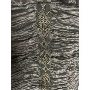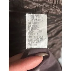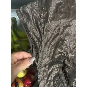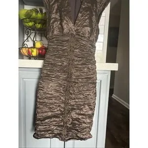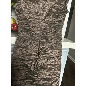Nicole Miller dress, size 10, in a gorgeous ruched metallic chocolate brown with cap sleeves, and a low-cut bust line accentuated into a detailed midline down the front of the dress.