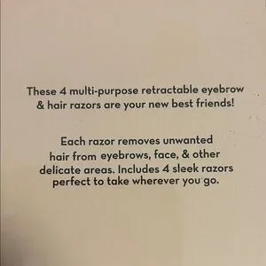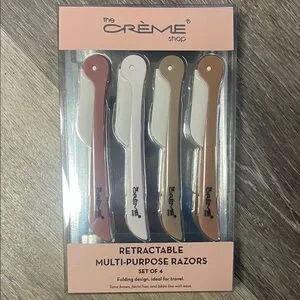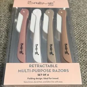 Set of 4 retractable multi-purpose razors. Includes muted pink, ivory, tan, and brown handles. Foldable design for convenience. Gentle precision for brows and facial touch-ups.