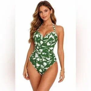 Turn heads this summer with this beautiful green floral halter one-piece swimsuit, designed to combine style, comfort, and a flattering silhouette. The elegant white floral print on rich green fabric creates a fresh, sophisticated look that is perfect for beach vacations, pool days, cruises, or resort getaways.