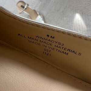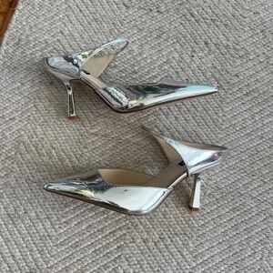 Chic Nine West mirrored metallic silver slingback pumps with a sleek pointed toe and elegant mid heel with elasticized front ankle strap. These statement heels add instant shine to any outfit and are perfect for parties, weddings, nights out, or elevating everyday looks. 3.5 inch heel.
