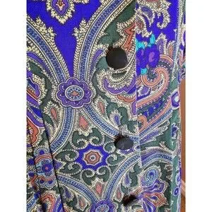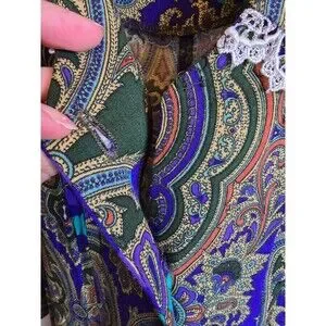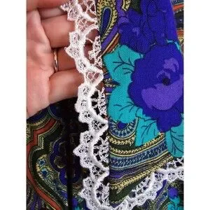 Vintage paisley patterned dress made by Dawn Joy Fashion. Lace around the neck. Beautiful blues, teals and greens in this dress. Pre loved and ready for a new home. ** missing one button ( the top)**