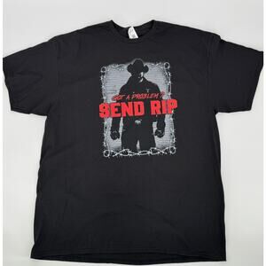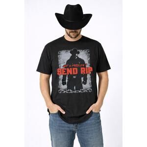 New with tags Yellowstone graphic t-shirt featuring a bold western silhouette design with the phrase “Got a Problem? Send Rip.” Inspired by the hit TV series Yellowstone, this shirt has a rugged western aesthetic with barbed wire framing and a cowboy silhouette graphic.