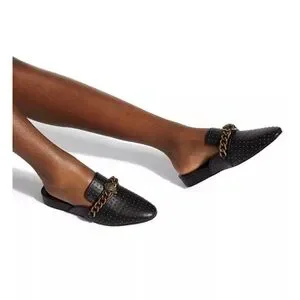 Sleek black leather mule with pointed toe. Gold chain and medallion accent for luxe detail. Covered in small gold-tone studs for texture. Slip-on design for easy wear. Stylish choice for polished casual looks.