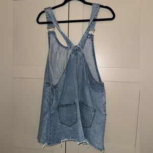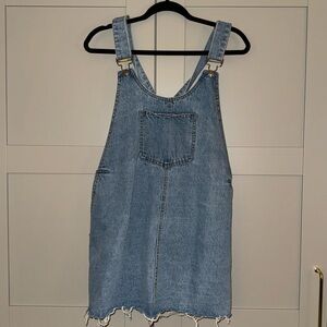 Stylish denim overall dress with front pocket and frayed hem. Perfect for casual outings.