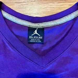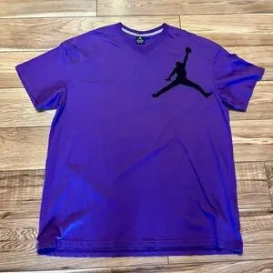 Stylish purple V-neck tee designed for everyday wear. Features a bold black athletic jump logo on the chest for a sporty look. Lightweight, breathable fabric for comfort during activities. Easy to pair with casual outfits.