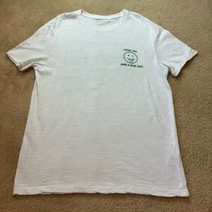 Classic crew neck tee with a small green smiley chest graphic. Soft-feel cotton blend for everyday wear. Simple, versatile design that layers well. Subtle branded detail for casual style.