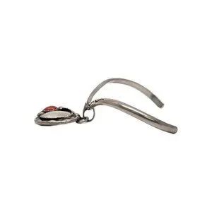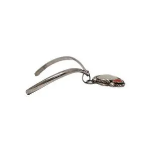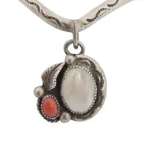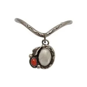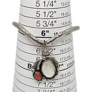 A thin V shaped stamped accent cuff bracelet features a dangle with mother of pearl and coral in sawtooth bezel settings, feather accent and stamped design.