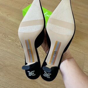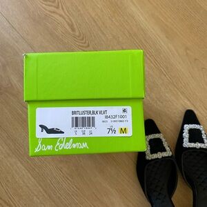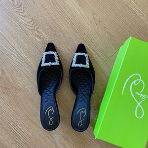 Chic black velvet heels. Features a sparkling embellished buckle. Perfect for stylish outings.