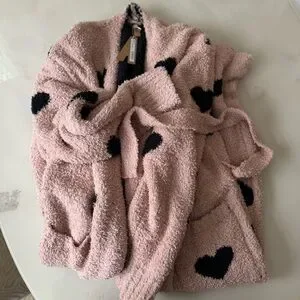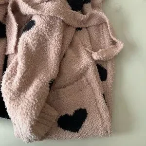 Soft plush robe with scattered heart motifs. Cozy shawl collar and front pockets. Plush, textured knit for warmth. Easy, relaxed fit for lounging.