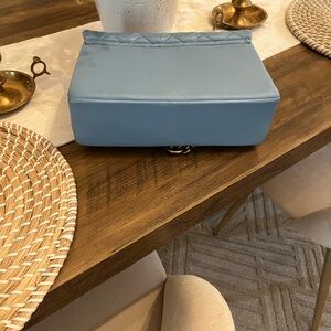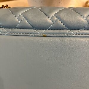 Chic light blue bag with quilted design. Features a bold gold chain strap. Perfect for elevating any look.