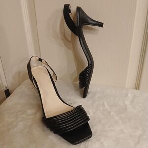H By Halston Hong Kong Black Sling Back Strappy Square Toe Kitten Heel Sandals, size 9. Glam, quiet luxury, basic, date night, girls night, prom, hoco, homecoming, night out, wedding.