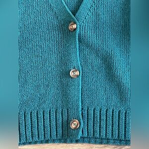 Chic green cardigan with a V-neck design. Features button-up front. Ideal for layering.