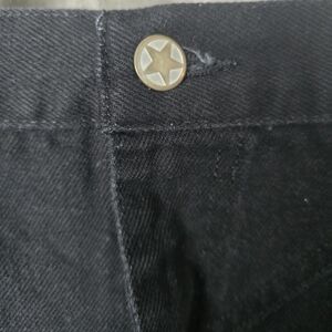 The Ozark Mountain Jeans for women in size 32x31 are a vintage pair of black high-rise denim with a button fly closure. These jeans feature a bareback style, slash pockets, and a comfortable fit. Made from 100% cotton, they are machine washable and suitable for all seasons. Embracing a Western theme, these jeans have a retro 80s and 90s vibe, perfect for a rodeo or everyday wear. Crafted in the USA, these mom jeans are a timeless addition to any wardrobe, offering both style and functionality.