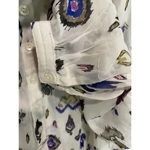 Great preowned condition, light semi sheer material. half button front closure , round neck blouse. Front of blouse is a bit shorter than the back, meant to be worn out and not tucked in.