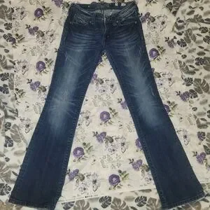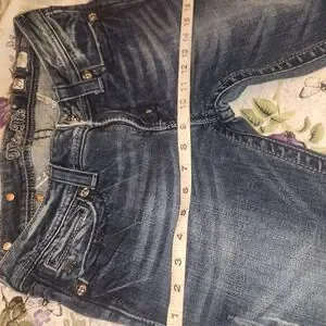 Miss Me boot cut jeans with decorative wing embroidery and rhinestone studs on back pockets. Classic blue denim with eye-catching metallic accents. Stylish detail that elevates everyday wear. No wholes or rips. No missing rhinestones. OFFERS WELCOMED!