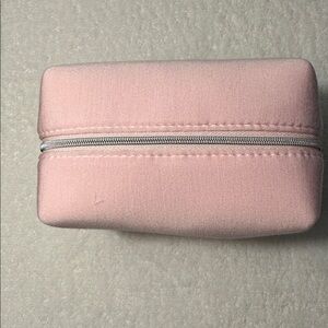 Compact Dior pouch in soft light pink. Embroidered CD logo on front. Smooth fabric finish. Ideal for small cosmetics or accessories.