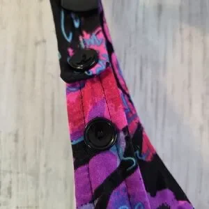 V-neck one-piece swimsuit with wide straps. Vibrant pink and purple floral print on a black base. Smooth stretch fabric for a flattering fit. Bold, retro-inspired look.