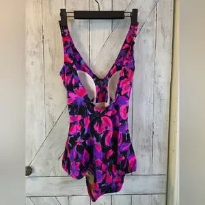 Maxine of Hollywood Black One-Piece with Pink & Purple Floral Print