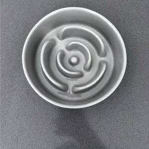 Round ceramic slow feeder bowl in gray. Raised maze interior promotes slower eating. Smooth glazed finish. Simple, modern design.