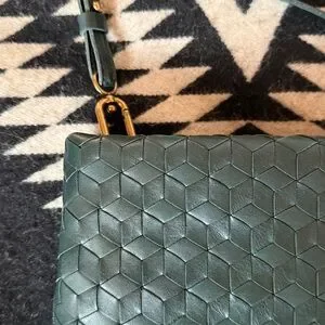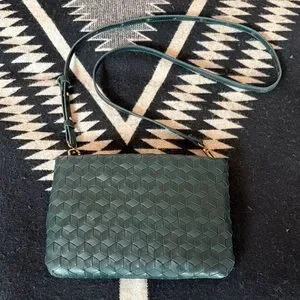 Forest green woven leather cross-body bad with zipper closure, one internal pocket, and adjustable, detachable strap. Can be used as a clutch. Measures 9 x 5.5 inches.