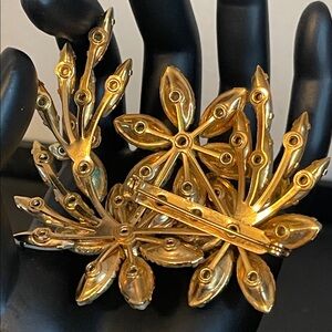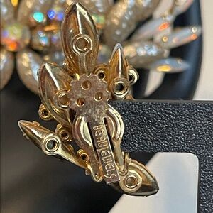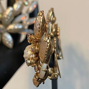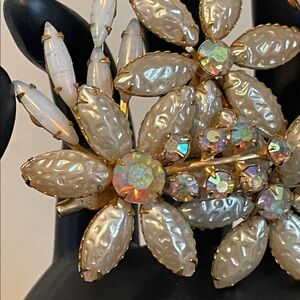 This beautiful 1950’s Beau Jewels vintage jewelry set is a demi-parure (matching two piece set) featuring a large brooch and matching clip-on climber earrings. Both pieces showcase a floral spray design with a combination of textured “crinkled” faux pearl stones, opaline rhinestones, and aurora borealis rhinestones all in a gold-tone setting. Earrings are stamped Beau Jewels and measure 1 1/2” x 1” with secure clips. Brooch measures 3” x 3 1/4” with a secure roll-over clasp. Excellent vintage condition, all stones in tact and secure.