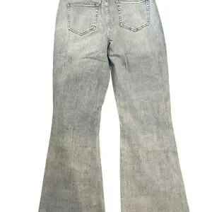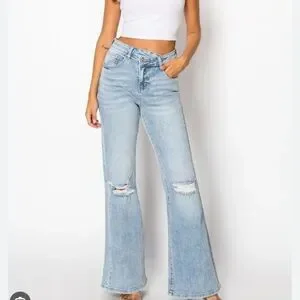Classic light wash flare jeans with distressed knee details. High-rise fit creates a flattering silhouette. Soft denim with subtle fading for everyday wear. Pairs easily with tees and heels. Color: light blue.
