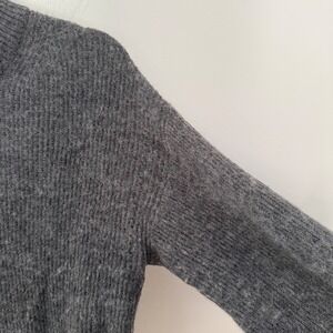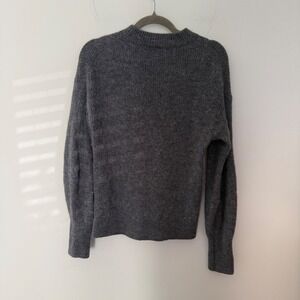 Ribbed knit sweater crafted from a premium blend of merino wool and baby alpaca for exceptional warmth and a soft, fuzzy texture. This charcoal grey pullover features a sophisticated mock neck and long sleeves with subtle puff detailing at the shoulders and elongated ribbed cuffs. The relaxed silhouette and drop shoulder design offer a modern, cozy fit perfect for layering during colder months.