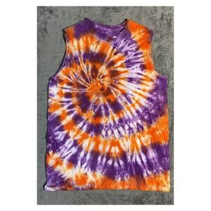 This vibrant tie-dye tank top from Fruit of the Loom is in excellent used condition, showcasing a stunning combination of purple and orange colors. Made from soft cotton, this sleeveless top is perfect for summer and spring activities. The tank top is designed for boys and features a comfortable crew neckline. Ideal for casual wear and those who appreciate retro and hippie themes. There are no visible defects, ensuring a stylish and comfortable fit for active days.