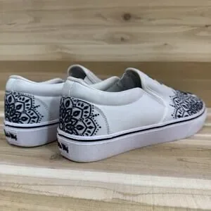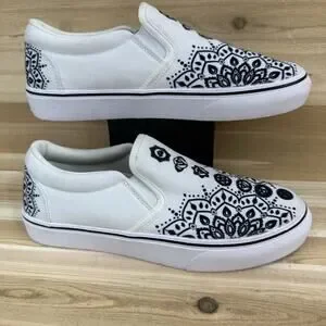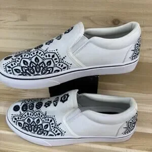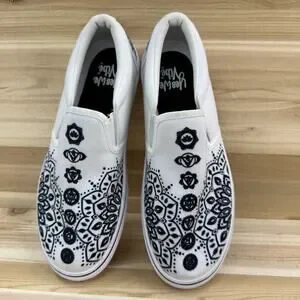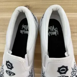 The Yes We Vibe Bohemian Slip On Shoes are a unisex casual shoe with a round toe shape and flat heel design, perfect for a casual occasion. Made of black and white canvas fabric, these slip-on shoes from the brand Yes We Vibe feature a rubber outsole for comfort and durability. The bohemian theme adds a stylish touch to these men's size 7 and women's size 9 shoes, making them a fashionable and comfortable choice for everyday wear.