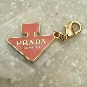Elegant Prada keychain charm. Features pink and gold tones. Perfect accessory for any bag.
