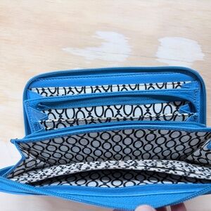 Beautiful turquoise leather zip-around wallet by HOBO. This continental-style wallet features multiple accordion compartments for organization along with a secure interior zip pocket for coins.