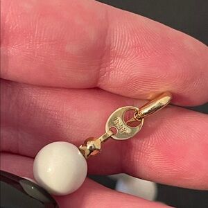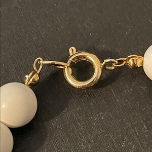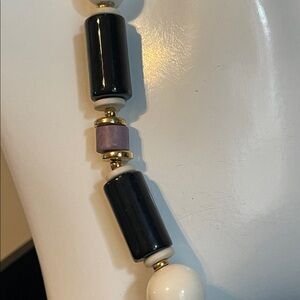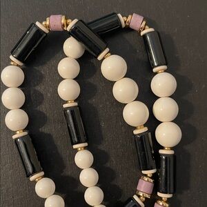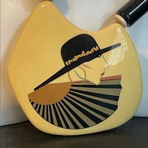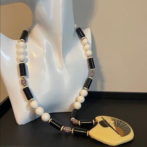 1980’s statement necklace stamped Japan. It features a large, cream-colored ceramic pendant with a hand-painted or illustrated "Art Deco" style lady wearing a wide-brimmed black hat and holding a fan. The necklace is composed of round white lucite beads, tubular ceramic black beads, cylindrical lavender beads, and small gold accent beads. The pendant has a distinctive, irregular shield-like shape that serves as the centerpiece of the "chunky" 80’s aesthetic. Necklace measures 22” with a spring-ring clasp and pendant measures 3” x 2 1/2”. There is minor wear to several of the beads but is not extremely noticeable nor visible when worn.