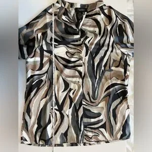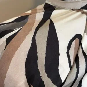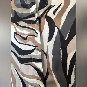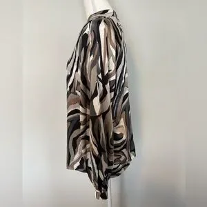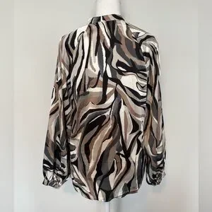 Papillon long sleeve button-down blouse in size Small featuring a striking abstract swirl pattern in earthy tones of brown, black, white, mocha, and cream. The marbled zebra-inspired print adds a unique statement while still being easy to style.