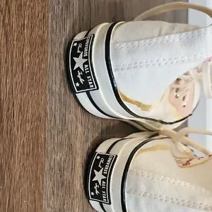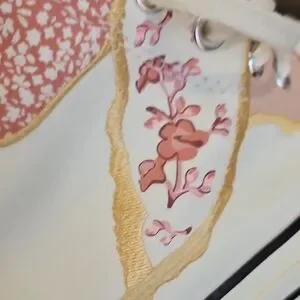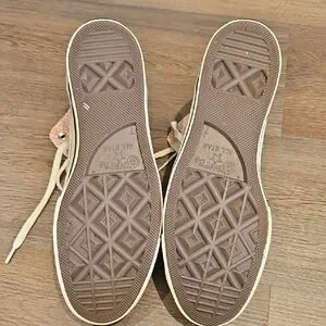 Classic Converse high-top silhouette with cream canvas base. Light pink floral and blush panels accent the ankle and sides. Lace-up front and iconic All Star patch at the ankle. Rubber sole with black stripe for a timeless look.
