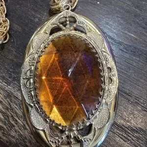 Gold necklace featuring a striking amber pendant. Adds sophistication to any look.