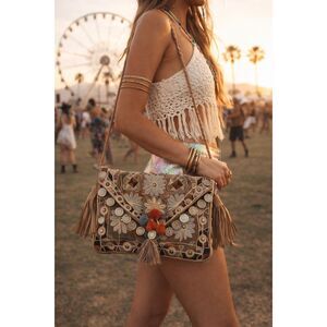 Designed with a structured envelope flap and magnetic snap closure, it opens to a spacious interior lined in cotton with a zip pocket for smaller essentials. The braided crossbody strap allows for easy hands-free wear, making it perfect for festivals, travel, or adding a statement piece to everyday outfits.