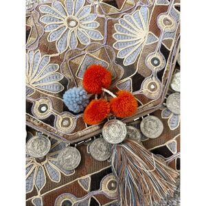 Beautiful Khanna Clutch from Anthropologie, featuring intricate embroidery and artisan-inspired embellishments. This eye-catching bag showcases detailed floral and geometric embroidery in warm neutral tones, accented with decorative coin charms, suede fringe tassels, and playful pom-pom detailing for a unique bohemian look.