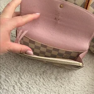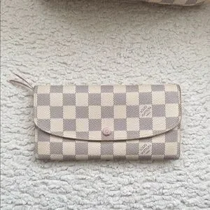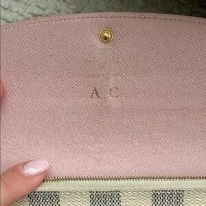 The Emilie wallet in Damier Azur canvas is a simple yet elegant design lined with grained cowhide leather. Its envelope-style flap opens to reveal a spacious interior compartment, zipped coin pocket and four card slots. With its slim-line format, the Emilie fits into any city bag, and can also double as a clutch. Does have gold foil AC initials heat stamped.