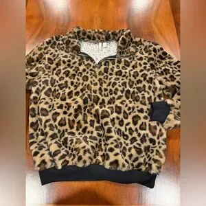 Cozy teddy jacket with bold leopard print. Soft plush fabric for warm comfort. Half-zip front with ring pull. Relaxed fit with elastic hem and cuffs. Stylish layering piece for casual looks.